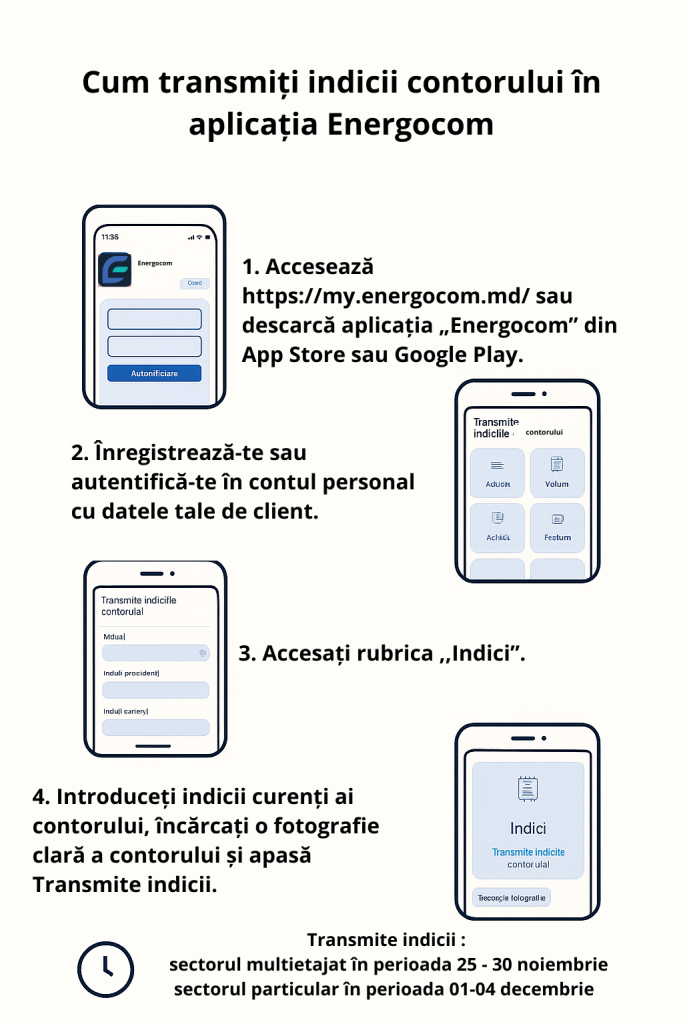 în Cabinetul personal accesînd pagina web: my.energocom.md sau aplicația mobilă energocom (disponibilă în App Store și Google Play), pentru sectorul multietajat în perioada 25.11.2025-30.11.2025 și pentru sectorul particular în perioada 01.12.2025-04.12.2025, urmând niște pași foarte simpli, după cum urmează: